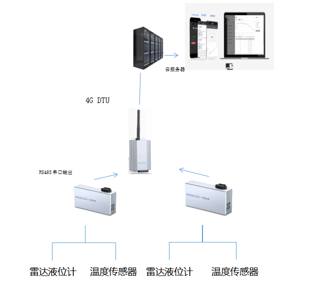 儲油罐液位、溫度在線監(jiān)測系統(tǒng)采用拓普瑞TP1608無線采集器和4G DTU為監(jiān)測現(xiàn)場核心設(shè)備。拓普瑞TP1608無線采集器采集液位計、溫度變送器的4~20mA輸出信號并通過4G網(wǎng)絡(luò)實時傳送給TLINK云平臺。